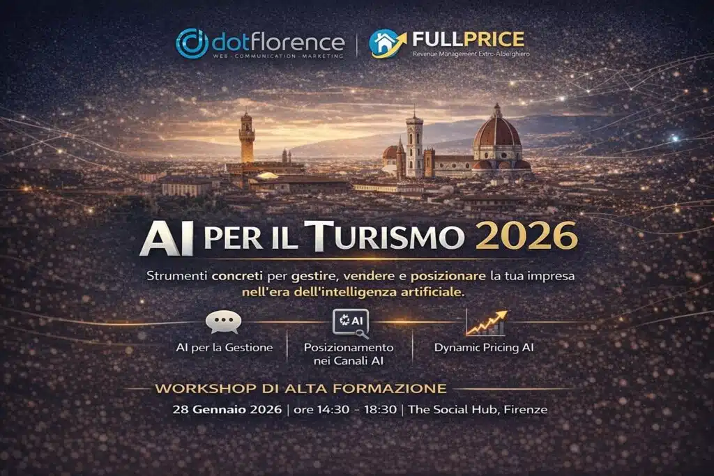 Questo workshop di alta formazione, organizzato da dotFlorence e Full Price, è pensato per chi vuole ridurre la dipendenza dalle OTA, migliorare l’efficienza operativa e prendere decisioni più intelligenti grazie ai dati e all’AI.