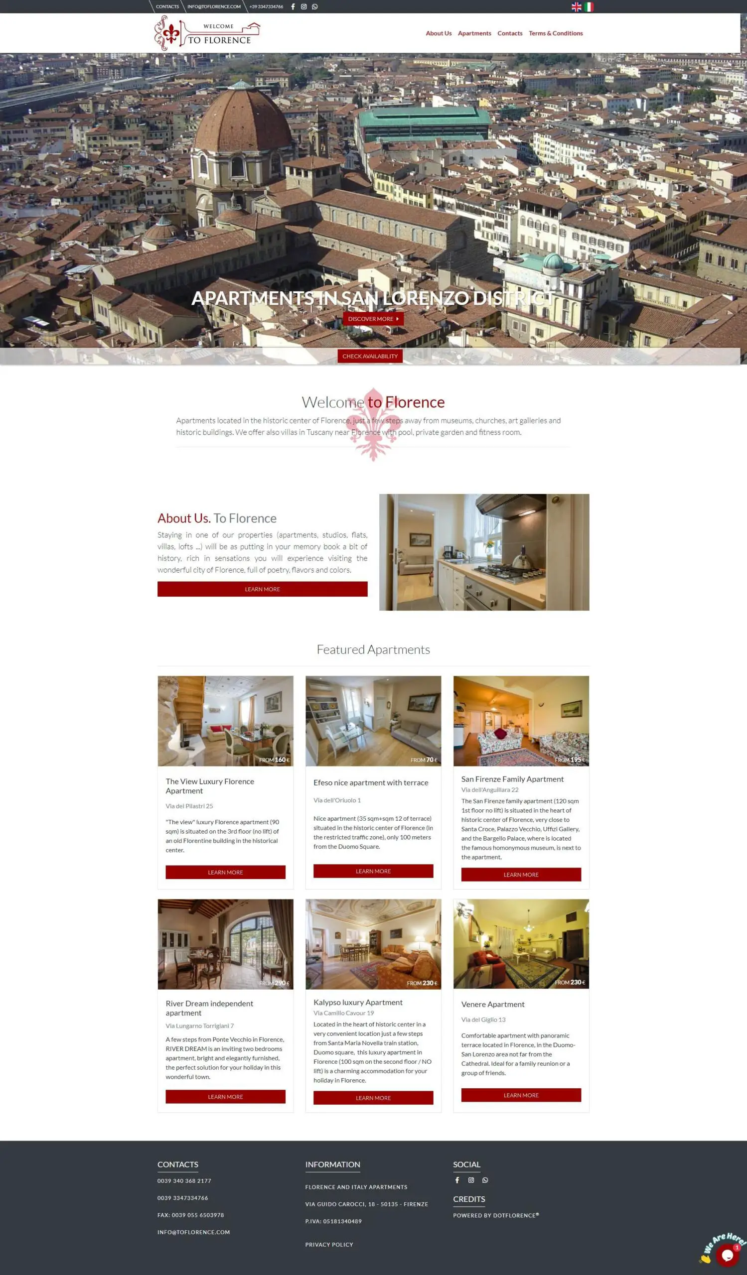 La maggior parte dei loro appartamenti sono situati nel centro storico, a pochi passi da musei, chiese, gallerie d'arte ed edifici storici...e per coloro che sono amanti della campagna vi proporranno ville sulle colline intorno a Firenze con piscina, giardino, sala  fitness, bed and breakfast.